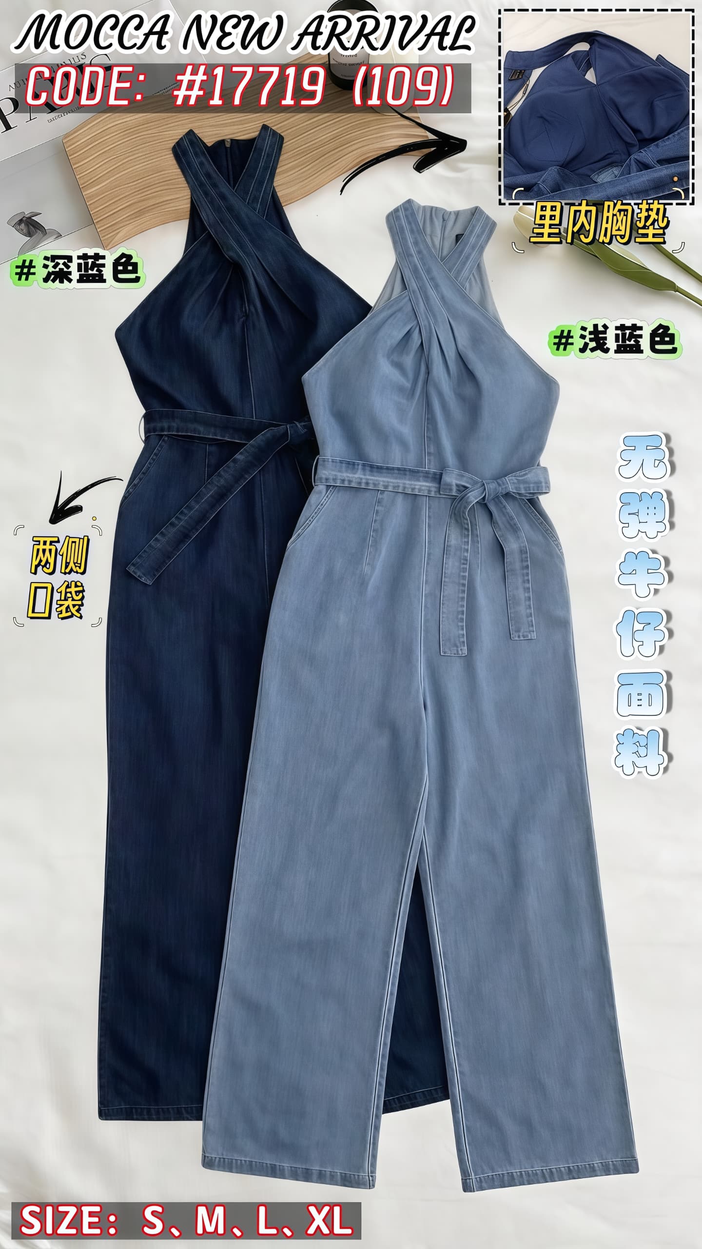 (高质量✔️没弹性牛仔面料✔️有胸垫✔️有口袋✔️背面拉链设计✔️附带本布腰带✔️)
