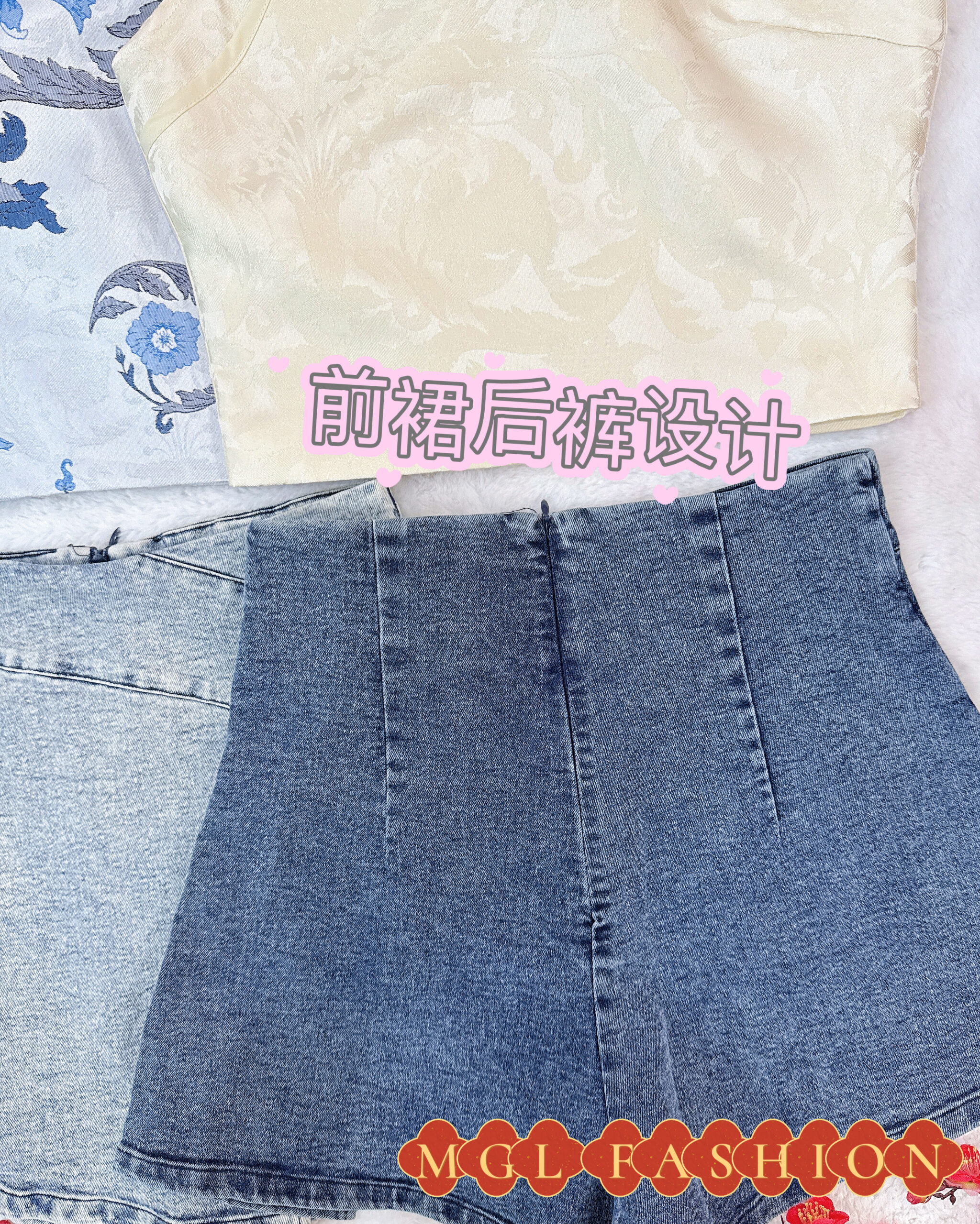(高质量✔️上衣没弹性提花面料✔️裙子微弹性牛仔面料✔️背面拉链设计✔️前裙后裤)