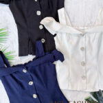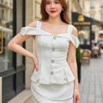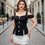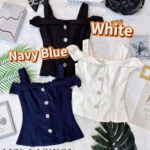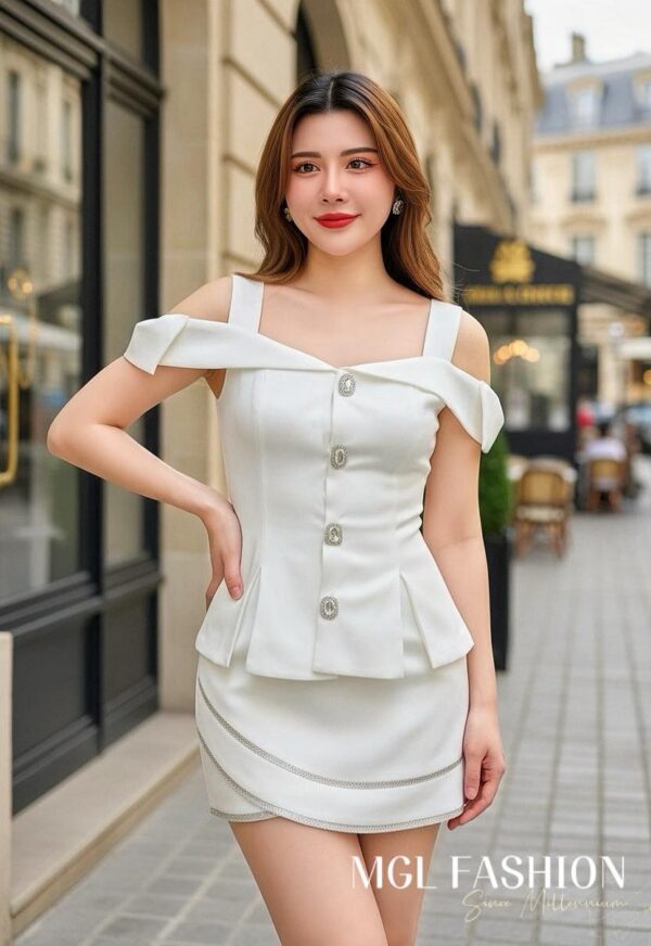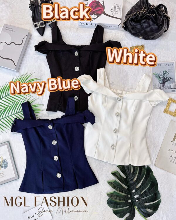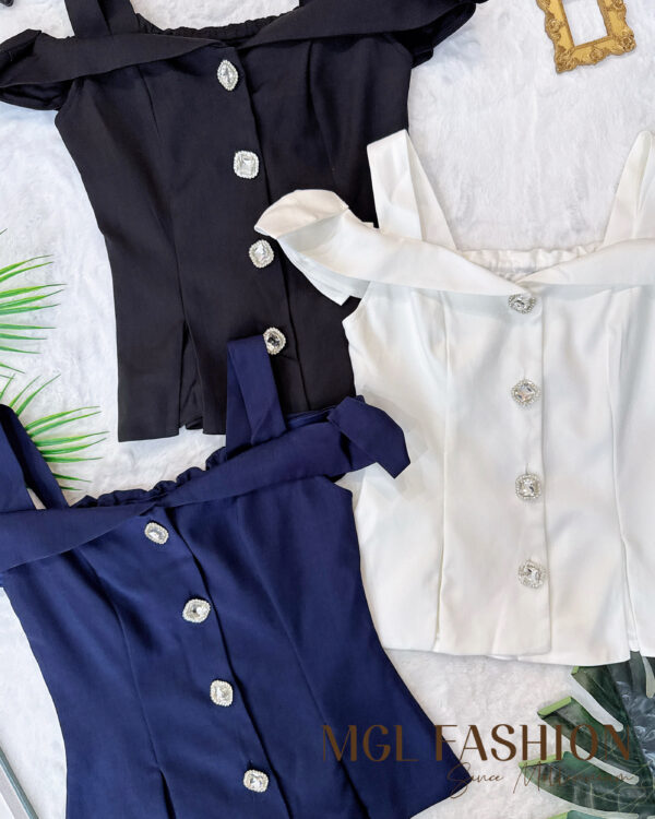 Mocca时尚高级轻奢名媛风蝴蝶结肩带亮钻纽扣设计长版时装上衣