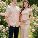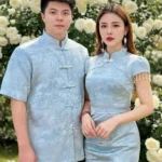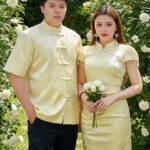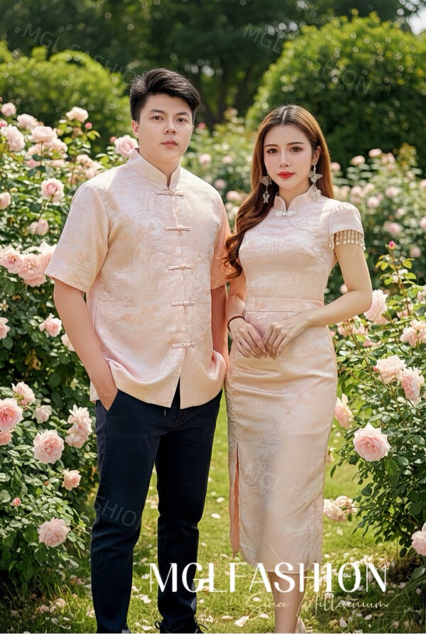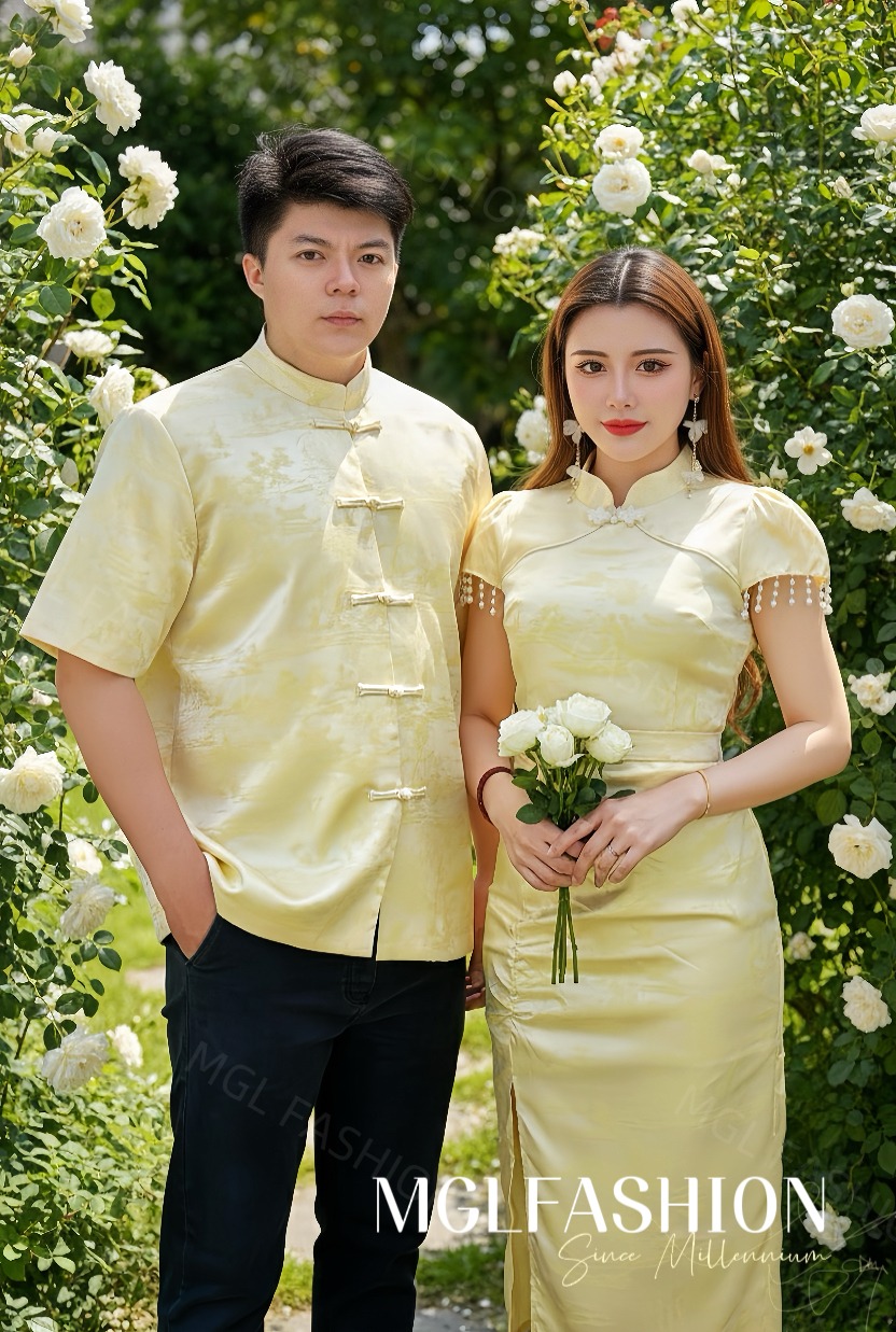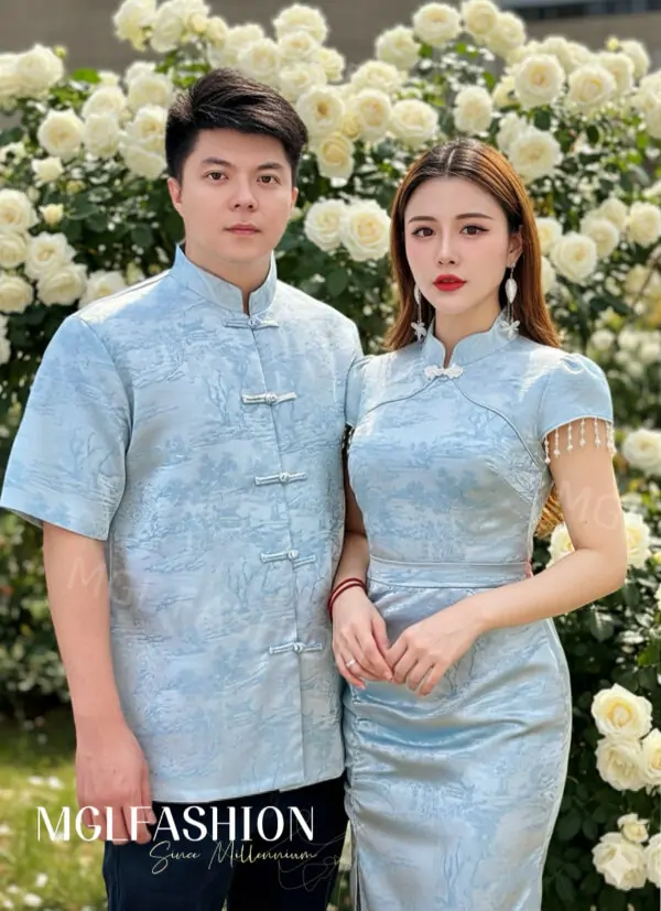 (高质量✔️没弹性超舒适江南楼亭提花面料✔️Full Lining✔️女装上衣精致珍珠吊坠设计✔️女装领口精致花边形设计✔️女装上衣背面拉链设计✔️女装裙子后腰拉链设计✔️符带内衬裤子✔️男装前开中国盘扣设计✔️男装超舒适不刺不热Full Lining✔️)
